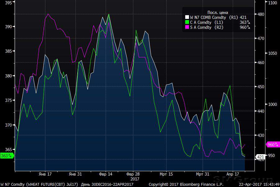 Своим падением, рынок все-таки подтвердил необснованность роста с 10 по 14 апреля, и теперь сдувает ценовой спекулятивный пузырь. Пшеница вернулась к двухмесячным минимумам, кукуруза растеряла ¾ роста, соя половину роста. Фундаментом для продаж выступила статистика USDA по прогнозам урожая, потребления и переходящих запасов, опубликованная еще 11 апреля. Согласно отчету, переходящие запасы пшеницы на конец 2016/2017 МГ составят рекордные 252,3 млн.т, по кукурузе – 223 млн.т, что выше на 2,3 млн.т мартовских оценок как к пшенице, так и по кукурузе. Прогноз урожая сои был повышен на 5,7 млн.т до рекодных отметок 423,1 млн.т, с увеличением прогноза переходящих запасов на 4,6 млн.т до рекордных отметок – 87,4 млн.т.