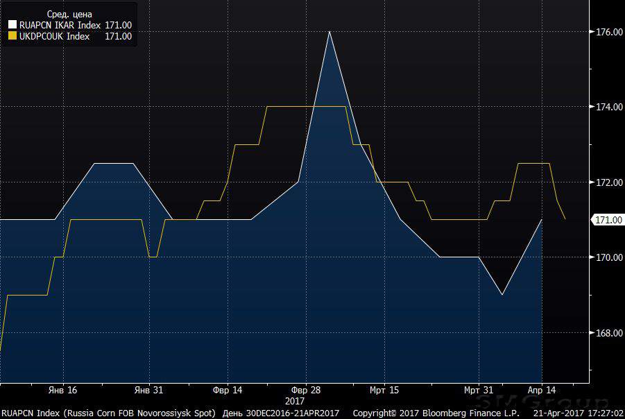 Исходя из доступных данных Bloomberg, спотовые цены российской кукурузы (FOB Novorossiysk) находятся на уровне $171, цены украинской кукурузы (FOB Black Sea) $171.