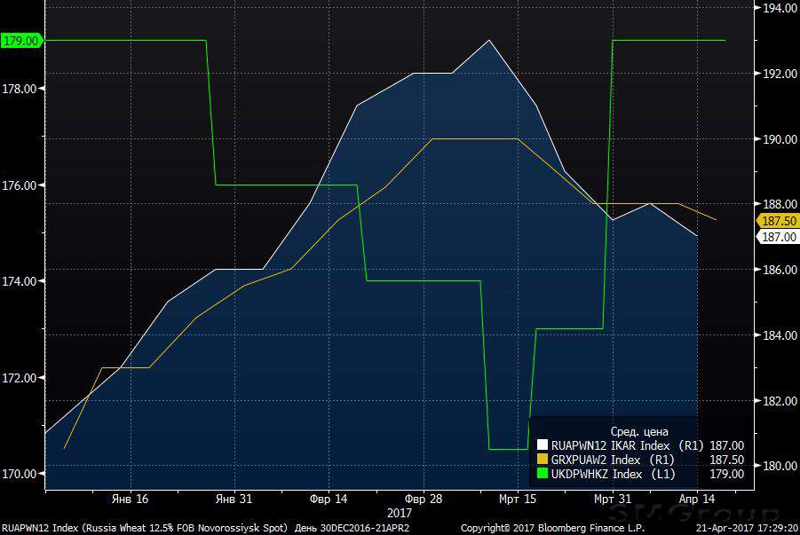 На рынках СНГ. Исходя из доступных данных Bloomberg, спотовые цены российской пшеницы (Wheat 12.5% FOB Novorossiysk) находятся на уровне $187,0, цены украинской пшеницы (Wheat 12.5% FOB Black Sea) $187,5, цены казахской пшеницы (Milling Wheat 12.5% FOB Aktau) - $179.