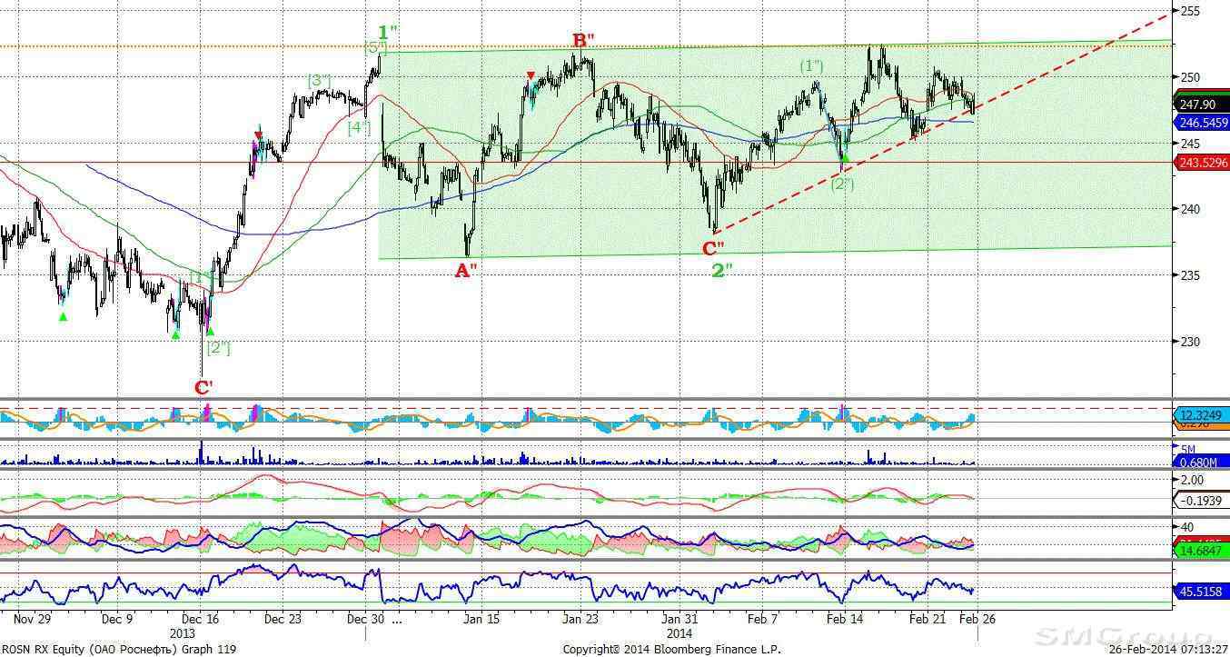 Индекс ММВБ – не показывает выраженной динамики. MACD сформировал сигнал вниз. DMI+ чуть ниже DMI-, ADX в нижней части шкалы и развернулся вверх, что указывает на начало развития нисходящего локального тренда. Осциллятор RSI побывал в зоне перепроданности, сигнал вверх. Индикатор, основанный на динамике ADX, 20 и 25 февраля дал сигналы к повышению.