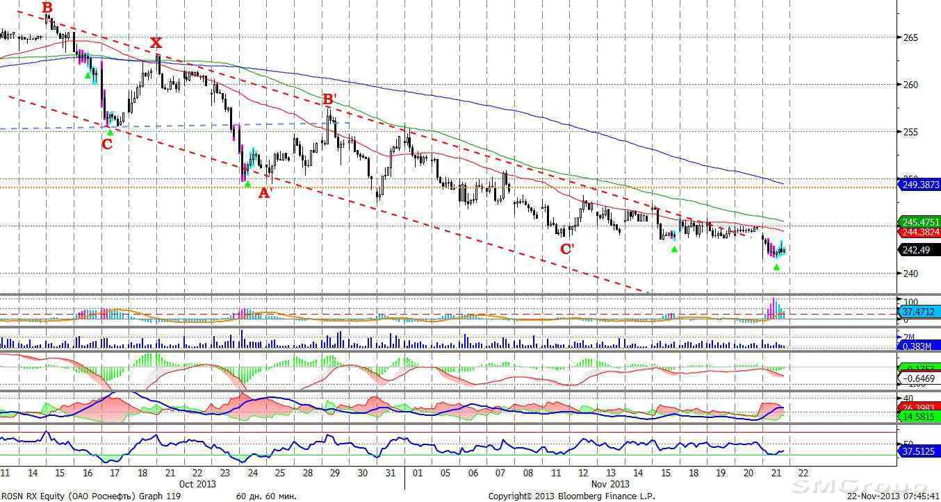 Индекс ММВБ – вышел вверх за пределы нисходящего канала. Ожидаем коррекционного снижения, после чего рост может продолжиться. MACD отрабатывает сигнал вниз. DMI+ находится ниже DMI-, ADX в средней части шкалы и направлен вверх, что говорит о наличии нисходящего локального тренда. Осциллятор RSI в средней части шкалы, сигналов нет. Индикатор, основанный на динамике ADX, 21 ноября дал сигнал к росту.
