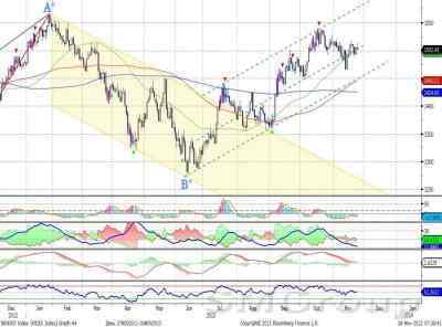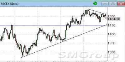 Индекс ММВБ – находится в нижней части восходящего канала. MACD продолжает отрабатывать сигнал вниз. ADX указывает на наличие нисходящего тренда, DMI+ находится ниже DMI-, ADX в средней части шкалы и направлен вверх. Осциллятор RSI находится в средней части шкалы, сигналов пока нет. Индикатор, основанный на динамике ADX, 2 декабря дал сигнал вверх.