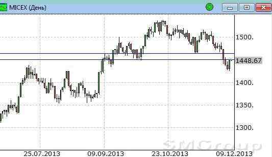 Индекс ММВБ – находится в нижней части восходящего канала. MACD продолжает отрабатывать сигнал вниз. ADX указывает на наличие нисходящего тренда, DMI+ находится ниже DMI-, ADX в средней части шкалы и направлен вверх. Осциллятор RSI находится