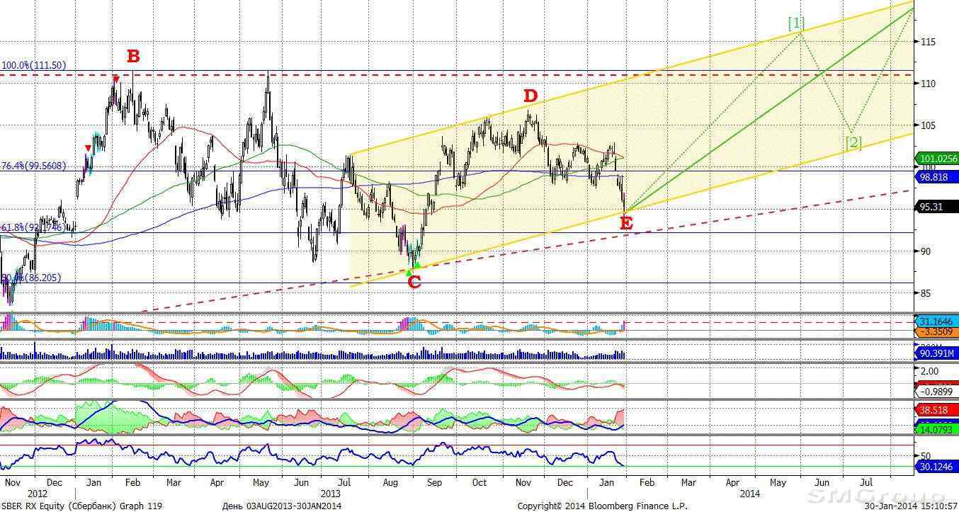 Сбербанк. Цены проторговывают верхний диапазон широкого бокового канала. В настоящее время котировки тестируют осевую линию боковика, которая расположена вблизи отметки 97 рублей. Технически пробой данной поддержки будет означать переход цен в новый