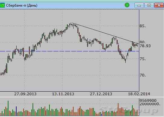 Сбербанк-пр. В настоящее время котировки тестируют горизонтальное сопротивление в районе отметки 78 рублей. Откат внутрь диапазона 78-75 рублей отсюда напрашивается. Однако, на данном этапе есть основания ожидать, что после этого покупатели вновь проявят инициативу с перспективой слома текущего сопротивления и оформления еще одной волны роста цен.