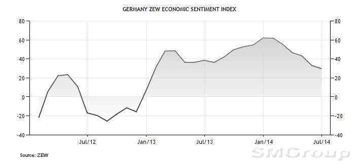 Евро упал на фоне снижения экономических ожиданий в Германии до 18-месячных минимумов. Индекс экономических ожиданий в Германии от ZEW продолжил снижение в июне шестой месяц подряд, против ожиданий роста. Индекс опустился до 29,8 п., по сравнению с 33,1 п. в мае. Доверие деловых кругов к экономике страны снижалось в последние месяцы из-за опасений по поводу кризиса на Украине, развивающихся рынков и замедления экономики Китая.