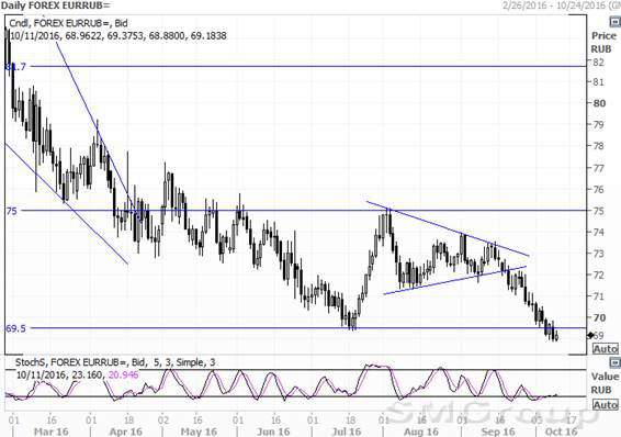 EUR/RUBНа наш взгляд, пробитие поддержки на уровне 69,5 не закрепится, и курс вернется в зону выше этой отметки в краткосрочной перспективе.