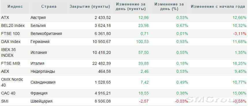 По итогам сессии британский индекс FTSE 100 увеличился на 0,01%, французский CAC 40 вырос на 0,38%, а немецкий DAX ушел в плюс на 0,38%. Региональный индикатор Stoxx Europe 600 увеличился, в свою очередь, на 0,3% и закрылся на отметке 376,75 пункта.