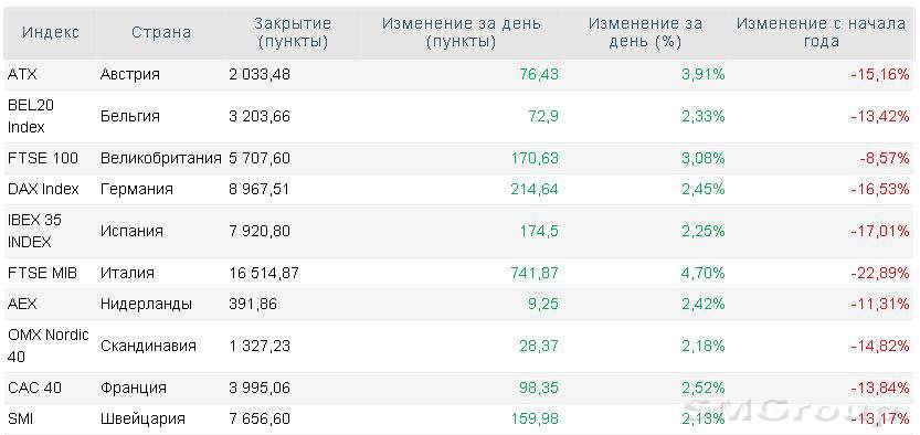 По итогам сессии ключевой индекс Великобритании FTSE 100 повысился на 3,1%, французский CAC 40 поднялся на 2,5%, а немецкий DAX ушел в плюс на 2,5%. Региональный индикатор STXE 600, в свою очередь, прибавил 2,91% и закрылся на отметке 312,41 пункта.