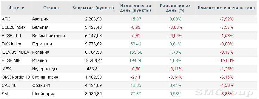 По итогам сессии британский индекс FTSE 100 упал на 0,09%, французский CAC 40 увеличился на 0,41%, а немецкий DAX ушел в плюс на 0,61%. Региональный индикатор Stoxx Europe 600 увеличился, в свою очередь, на 0,6% и закрылся на отметке 340,97 пункта.