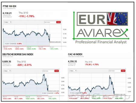 По итогам торгов в четверг основные индексы Европы показали следующие результаты: FTSE 100 – 6036.7, -109.62, -1.78%, DAX – 9498.15, -224.94, -2.31%, CAC 40 – 4350.35, -75.30, -1.70%.Европейские индексыКлючевые фондовые индексы Европы показали вчера