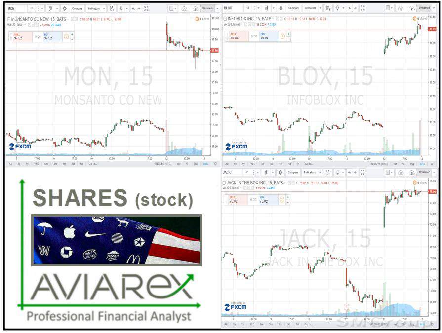 Обзор акций. США Лидеры:Monsanto (крупнейший в мире поставщик семян) – акции взлетели на 8,4% на фоне появившейся в СМИ информации о том, что немецкий гигант химической и фармацевтической промышленности Bayer готовится сделать компании предложение о приобретении.
