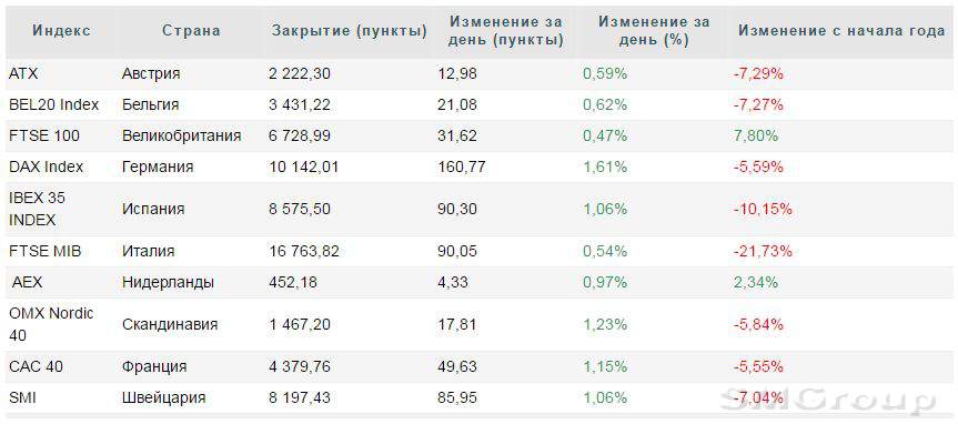 По итогам сессии британский индекс FTSE 100 вырос на 0,47%, французский CAC 40 увеличился на 1,15%, а немецкий DAX ушел в плюс на 1,61%. Региональный индикатор Stoxx Europe 600 увеличился, в свою очередь, на 1,03% и закрылся на отметке 340,81 пункта.