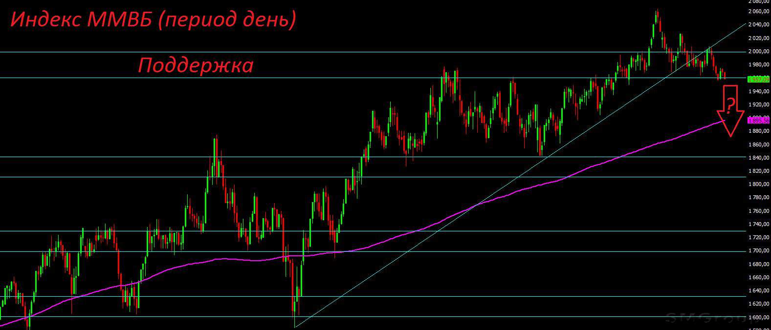 Российский рублёвый индекс ММВБ вплотную подошёл к важному техническому уровню, на отметке 1960 пунктов. Его пробой откроет дорогу к серьёзной коррекции в пределах 10%. Вчера индекс уже закрылся ниже этого рубежа, ждём теперь подтверждение пробоя.