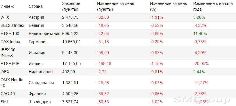 По итогам сессии ключевой индекс Великобритании FTSE 100 понизился на 0,6%, французский CAC 40 опустился на 0,86%, а немецкий DAX ушел в минус на 0,29%. Региональный индикатор STXE 600, в свою очередь, потерял 0,54% и закрылся на отметке 338,97 пункта.