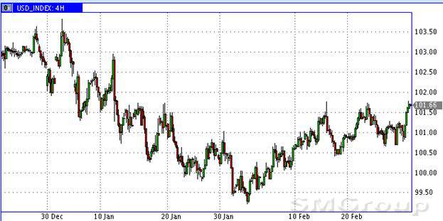 Относительно рекомендаций на ближайшую перспективу, я бы рекомендовал ставить на рост индекса доллара (см. график) и укрепление американской валюты по отношению к евро и фунту. Вероятность повышения ставки на заседании ФРС 15-го марта сейчас оценивается рынком в 65%-70%.