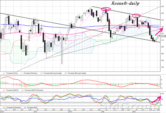 Сегодня отдельно хочу обратить ваше внимание на акции Роснефти. Если выбирать бумагу, которая еще не успела «улететь», то это как раз акции нефтяной компании, которые нашли поддержку на линии нисходящего тренда от 21 апреля 2011 года. Даже в рамках нисходящего канала акции могут протестировать верхнюю границу в районе 223-225р, к тому же нефть тестирует свои максимумы. Но, так как бумага выглядит немного хуже остальных представителей нефтегазового сектора, стоп советую ставить за предыдущий минимум (208р).