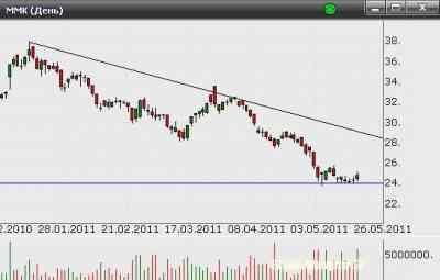 Перейдём к рассмотрению ситуации сложившейся в индексе ММВБ. В четверг индекс ММВБ остановился на отметке 1630,72. Обратимся к дневному временному интервалу. На графике показаны средние скользящие с периодом 60 Moving Average, 90 Moving Average и 200 Moving Average – красного, синего и зелёного цвета соответственно. С 25 апреля 2011 года мы видим нисходящее движение. Характер движения последних четырех свечей привёл к ситуации, когда средняя скользящая 60 Moving Average пересекает среднюю скользящую 90 Moving Average. Данное обстоятельство указывает на продолжение нисходящего движения. Но в нашей ситуации мы имеем также взаимодействие цены со средней скользящей 200 Moving Average. Цена встретила сопротивление именно на уровне данной средней скользящей. 19 апреля котировки индекса ММВБ отскочили от зелёной линии. Цены заключены в рамки: сверху средние скользящие с периодом 60 МА и 90 МА, снизу средняя скользящая с периодом 200 Moving Average. В ближайшее время мы будем наблюдать сужение данных рамок, что приведёт к “взрывному” движению котировок в ту или иную сторону. Чем уже границы, тем сильнее будет движение. Обратим внимание на канал белого цвета.