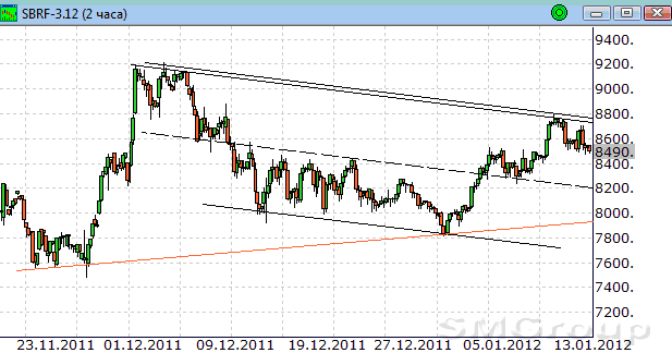 акции Сбербанка рассмотрим подробнее. Ниже представлен двухчасовой график котировок по состоянию на закрытие 12 января.