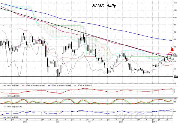 Вчера состоялся очередной пробой нисходящего тренда, на этот раз в бумагах НЛМК, которые вчера были одним из лидеров роста по итогам дня. Я жду продолжения восходящего движения, а дополнительным сигналом будет закрытие недельной свечи над 73,3р. При соблюдении последнего условия, мы можем увидеть рост котировок сначала до 78р, а затем и до 81р.