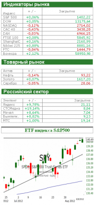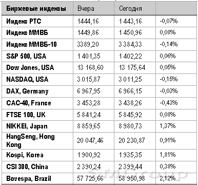 Комментарий по рынкуС трудом проползает индекс ММВБ через сопротивление 1450 пунктов. Сегодня на фоне высокой волатильности за основную торговую сессию индекс прибавил 0,48%, закрывшись на уровне 1 456,41 пунктов. Такое закрытие дает надежду на оптимизм, но все будет зависеть от динамики внешних площадок: российский рынок сейчас слишком слаб, чтобы двигаться за счет внутренних резервов.