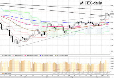 То есть индекс ММВБ легко в течение вчерашнего дня преодолел отмеченный уровень поддержки 1510 пунктов. Пока это может говорить о том, что технически все движение выше линии долгосрочного понижательного тренда было ложным. И тренд опять выступает в качестве уровня сопротивления. Поддержками по ММВБ являются уровни 1470 пунктов (23,6%-ный уровень коррекции Фибоначчи от роста с минимума мая), 1450 пунктов (200-дневная средняя). Дальше можно говорить о рубеже в 1400 пунктов.