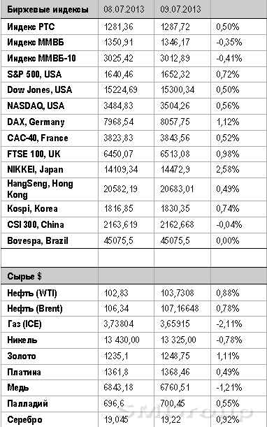 Новости мировых рынков▼ Международный валютный фонд (МВФ) уже в третий раз за год понизил прогноз роста мирового ВВП в 2013 году. В октябрьской редакции обзора мировой экономики (World Economic Outlook, WEO) МВФ прогнозировал этот показатель на уровне 3,6%, в январе снизил оценку до 3,5%, в апреле - до 3,3%. В новой версии WEO, опубликованной во вторник, рост глобального ВПП в текущем году прогнозируется в размере 3,1%. Прогноз на 2014 год также был понижен - с 4%, прогнозировавшихся в апреле, до 3,8%.