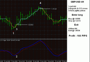 Точка 2-Работа на смене тренда.Первым появляется сигнал индикатора "Stock".Необходимо подождать появление стрелки индикатора "Luk".Если меняется восходящий тренд, то стрелка должна быть красной если нисходящий тренд, то синей.Стрелка должна появиться как можно ближе к сигналу первого индикатора ("Stock").В случае если мы не успеваем войти по сигналам обоих индикаторов на вершине (впадине),помните про правило "второго шанса",рынок вероятно может повторно оттестировать точку начала движения и можно будет войти на втором сигнале индикатора "Luk".Этот момент продемонстрирован точкой 3.И все же оснвным сигналом стратегии является два сигнала описаных ранее индикаторов.Как мы уже говорили, стратегия относитя к ряду консервативных и не совсем пригодна для работы на быстрых рынках.Есть сигнал-входим в рынок, нет-ждем сигнала.