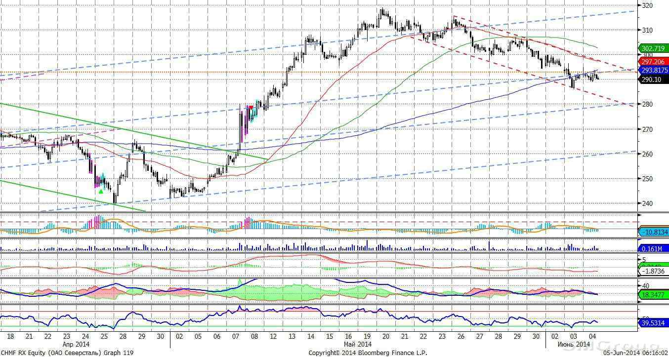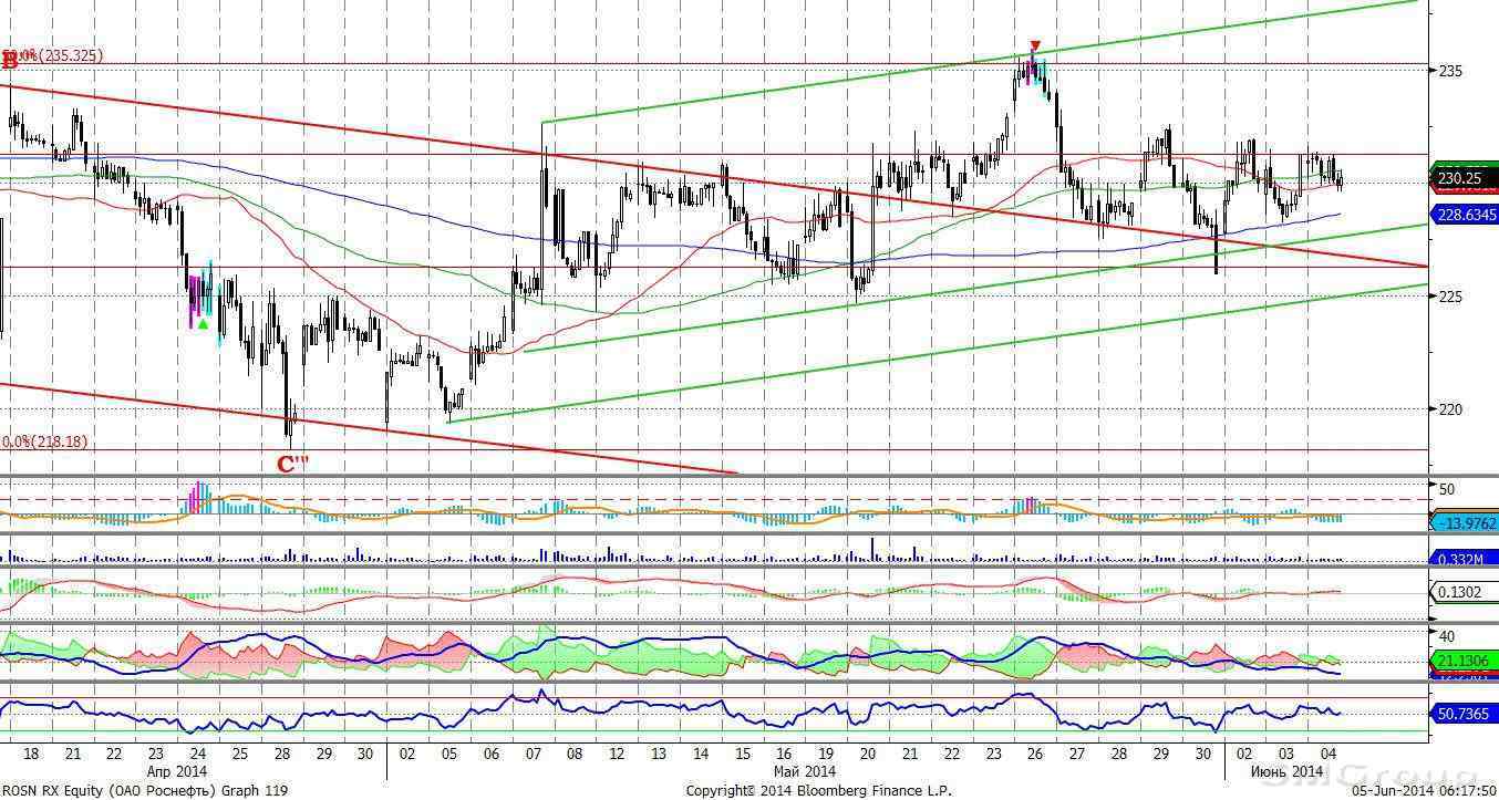 Сбербанк – у нижней границы восходящего канала (светло синий пунктир), возможно прекращение среднесрочного тренда роста. MACD сформировал сигнал вверх. ADX указывает на наличие восходящего локального тренда. Осциллятор RSI коснулся зоны перекупленности, сигнал к снижению. Индикатор, основанный на динамике ADX, 2 июня дал сигнал к понижению.