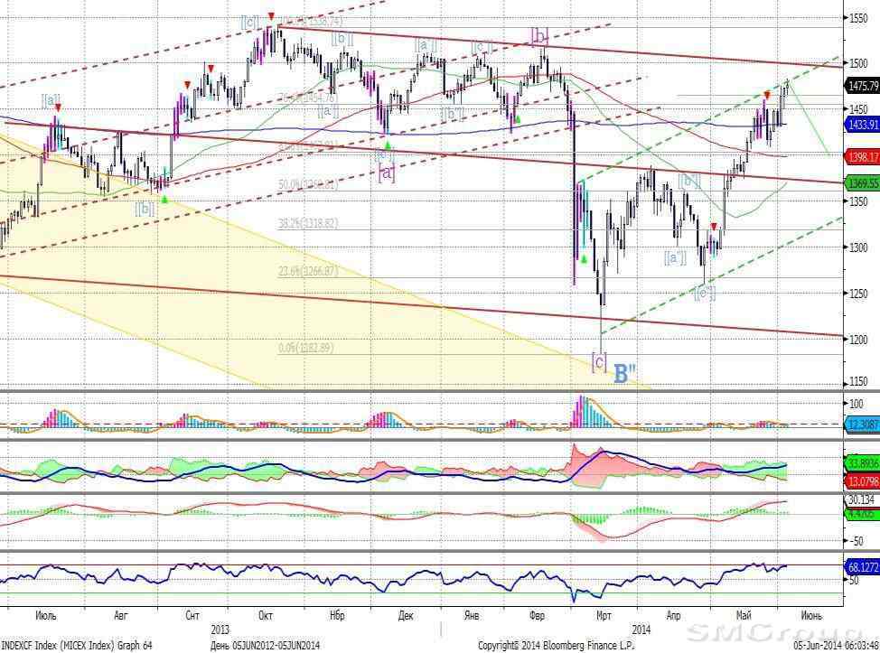 Индекс ММВБ – остается в пределах восходящего локального тренда. MACD выглядит нейтрально. DMI+ выше DMI-, ADX в средней части шкалы и направлен горизонтально, что указывает на наличие умеренного восходящего локального тренда. Осциллятор RSI побывал в зоне перекупленности, сформирован сигнал к снижению. Индикатор, основанный на динамике ADX, 30 мая, 2 и 4 июня дал сигналы к снижению. Рекомендация: Вне рынка.