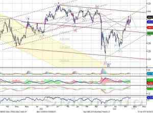 Индекс ММВБ – движется вверх с широкой амплитудой. MACD выглядит нейтрально. ADX указывает на наличие восходящего тренда, DMI+ выше DMI-, ADX в средней части шкалы и направлен немного вверх. Осциллятор RSI побывал в зоне перекупленности, сигнал вниз. Индикатор, основанный на динамике ADX, 27 мая дал сигнал к снижению.