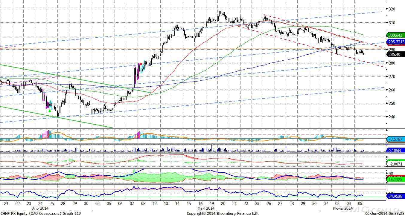 Северсталь – движется вниз. MACD выглядит нейтрально. ADX указывает на отсутствие локального тренда. Осциллятор RSI побывал в зоне перепроданности, сигнал вверх. Индикатор, основанный на динамике ADX, в настоящее время выглядит нейтрально. Поддержка: 280,0.