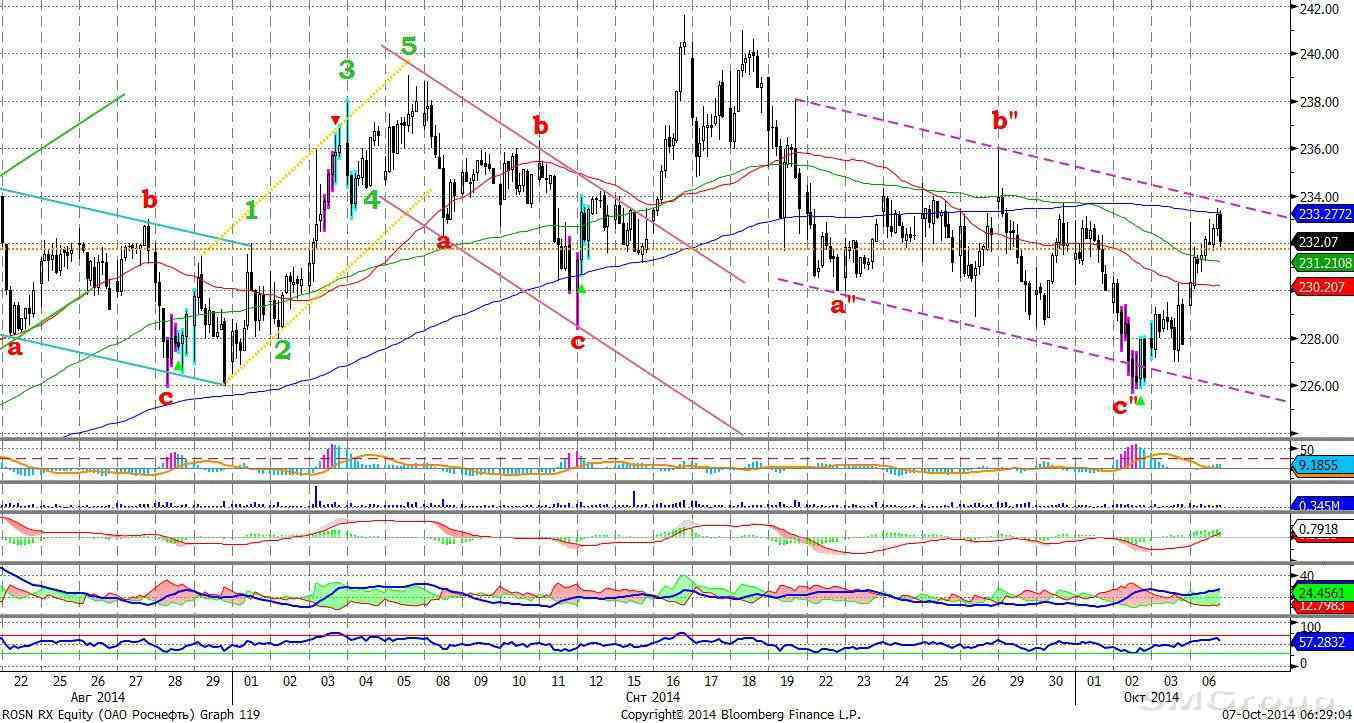 Роснефть – достигла верхней границы нисходящего канала, после небольшого коррекционного снижение может продолжить рост. MACD отрабатывает сигнал вверх. ADX указывает на зарождение восходящего локального тренда. Осциллятор RSI коснулся зоны перекупленности, неуверенный сигнал вниз. Индикатор, основанный на динамике ADX, в настоящее время выглядит нейтрально.