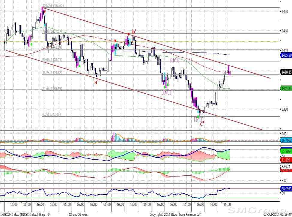 Индекс ММВБ – возобновил рост. MACD завершает отрабатывать сигнал вниз. ADX указывает на попытку сильное замедление нисходящего тренда, DMI+ незначительно ниже DMI-, ADX в нижней части шкалы и направлен немного вверх. Осциллятор RSI находится в средней части шкалы, сигналов нет. Индикатор, основанный на динамике ADX, 6 октября сформировал сигнал к росту.