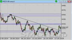 Индекс ММВБ – достиг поддержки. MACD выглядит нейтрально. ADX указывает на наличие слабого нисходящего тренда, DMI+ чуть ниже DMI-, ADX в средней части шкалы и движется немного вверх. Осциллятор RSI находится в средней части шкалы, сигналов