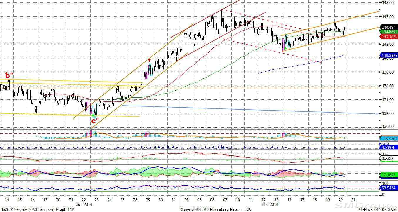 Индекс ММВБ – достиг уровня сопротивления. MACD выглядит нейтрально. ADX указывает на замедление восходящего тренда, DMI+ выше DMI- (индикаторы начали постепенно сходиться), ADX в средней части шкалы и направлен горизонтально. Осциллятор RSI