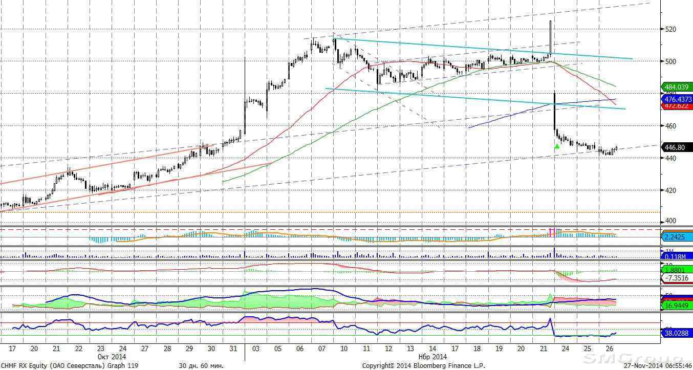 Северсталь – котировки резко снизились после среза реестра акционеров. MACD сформировал сигнал вверх. ADX указывает на замедление нисходящего локального тренда. Осциллятор RSI побывал в области перепроданности, сигнал к росту. Индикатор, основанный на динамике ADX, 24 ноября дал сигнал вверх.