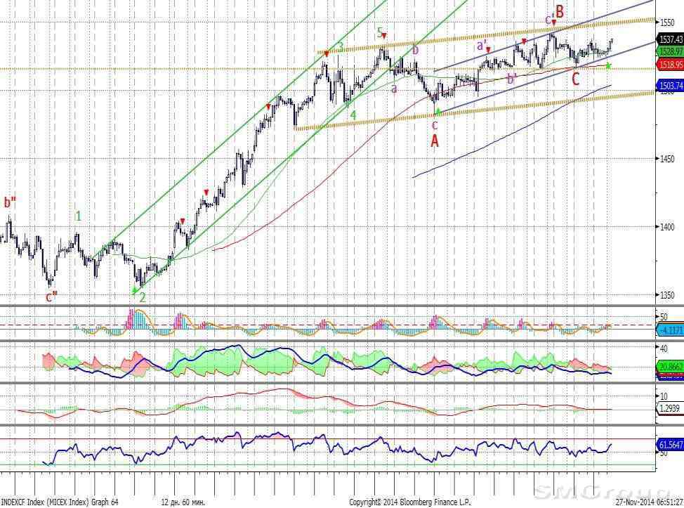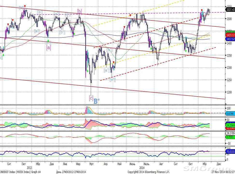 Индекс ММВБ – консолидируется. MACD выглядит нейтрально. DMI+ и DMI- сошлись, ADX в нижней части шкалы и направлен вниз, что указывает на отсутствие локального тренда. Осциллятор RSI находится в средней части шкалы, сигналов нет. Индикатор, основанный на динамике ADX, 24 ноября сформировал сигнал к снижению.