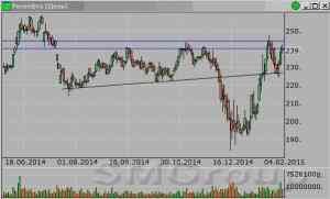 Роснефть – формирует восходящий тренд. MACD отрабатывает сигнал вверх. ADX указывает на наличие восходящего локального тренда. Осциллятор RSI в области перекупленности, в скором времени будет сформирован сигнал к снижению. Индикатор, основанный на динамике ADX, 6 февраля дал сигнал вниз.