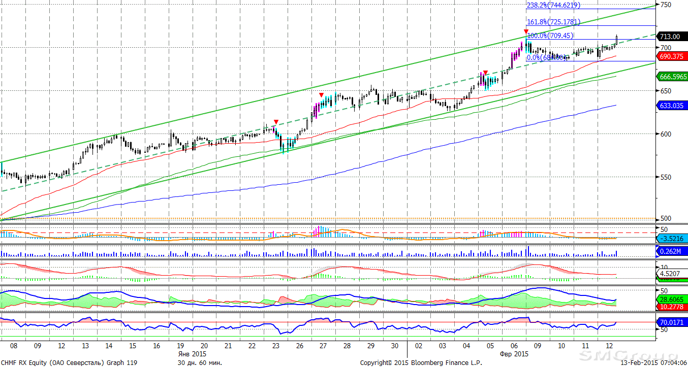 Индекс ММВБ – движется вверх. MACD отрабатывает сигнал вверх. DMI+ выше DMI-, ADX в верхней части шкалы и направлен вверх, что говорит о наличии восходящего тренда. Осциллятор RSI побывал в области перекупленности, сформирован сигнал вниз.