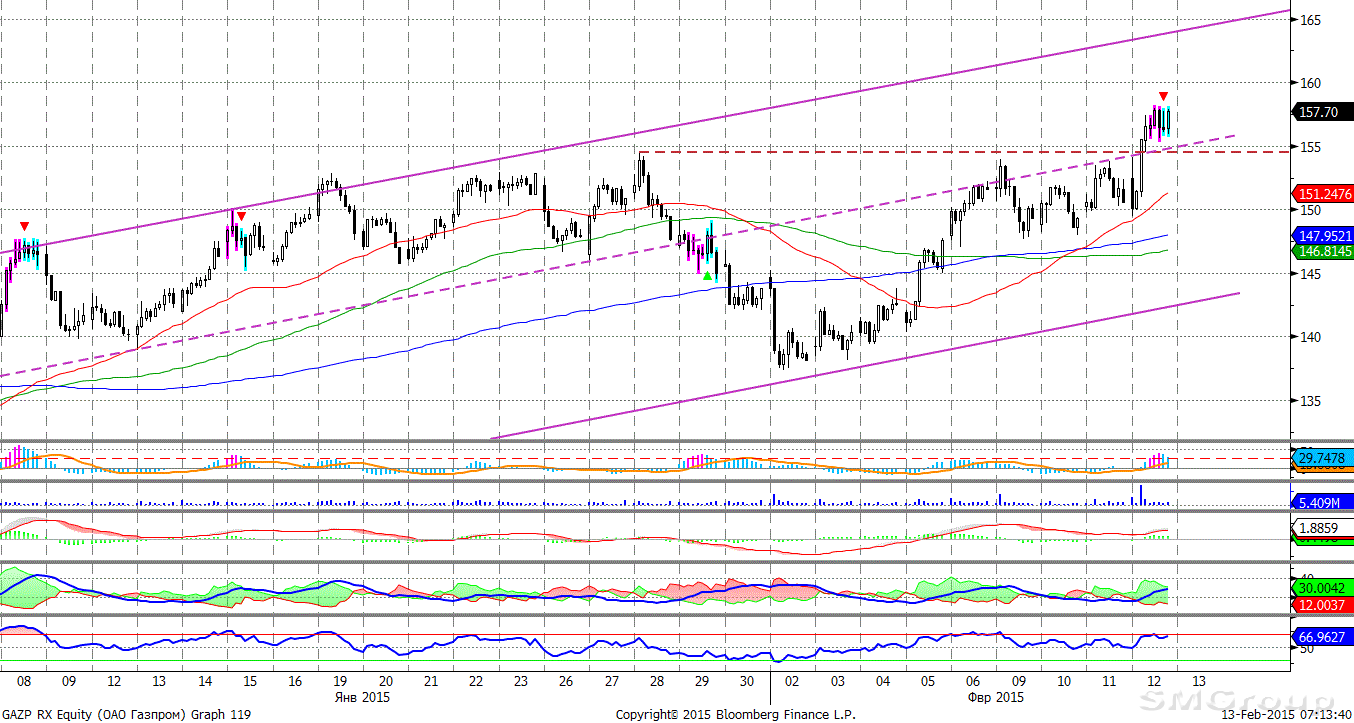 Газпром. В настоящее время цены пытаются выйти вверх из продолжительной консолидации в рамках сужающегося диапазона торгов. Учитывая общую картину, а также визуальную отсталость цен от индекса ММВБ, успех покупателей способен привести к ощутимому