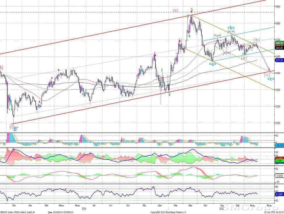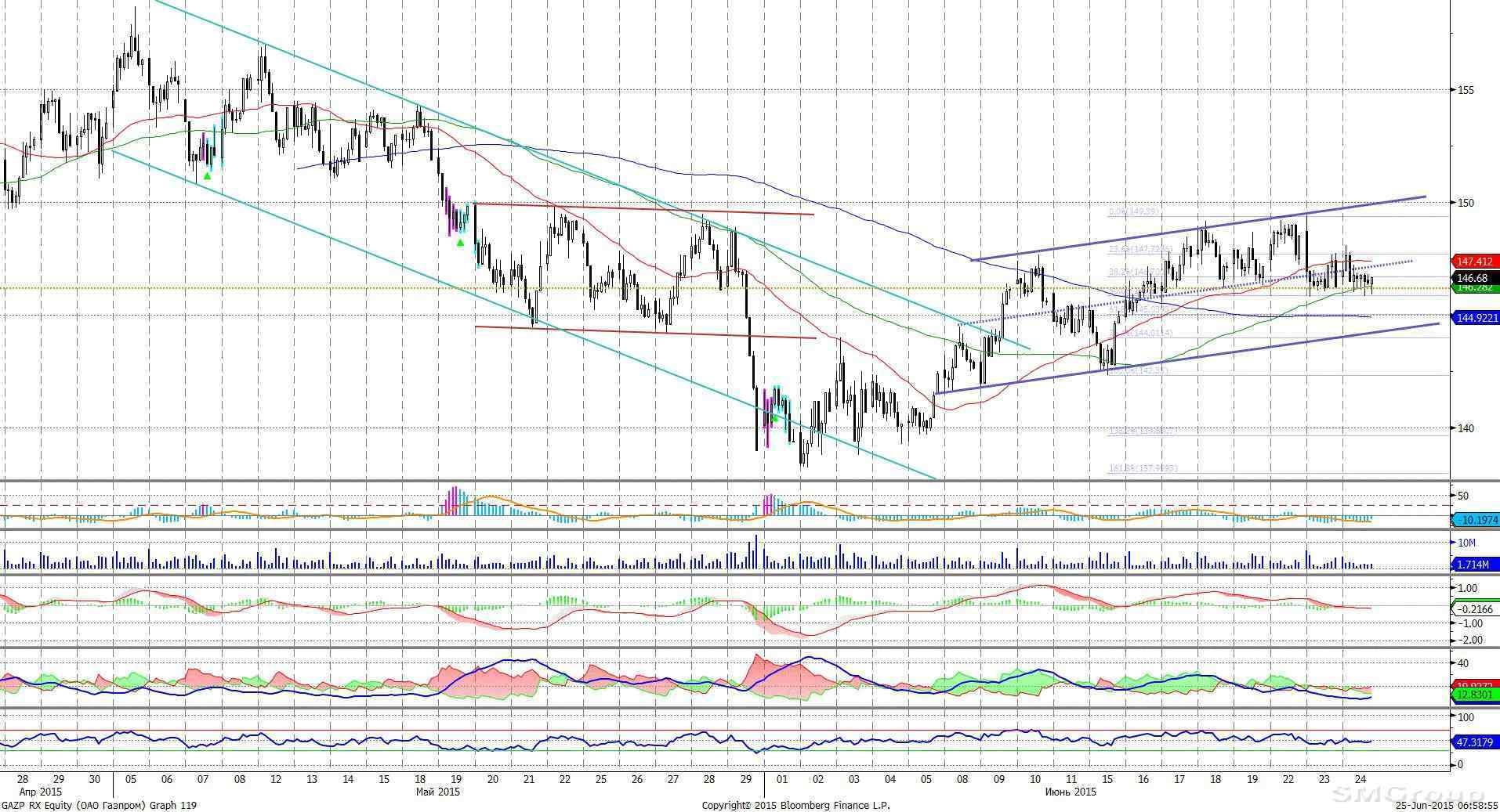 Индекс ММВБ – получил поддержку у нижней границы умеренно восходящего канала. Возможен умеренный рост. MACD в процессе формирования сигнала вверх. DMI+ ниже DMI-, ADX в средней части шкалы и направлен вверх, что указывает на наличие нисходящего локального тренда. Осциллятор RSI приблизился к области перепроданности, сигналов нет. Индикатор, основанный на динамике ADX, 24 июня сформировал сигнал к росту.