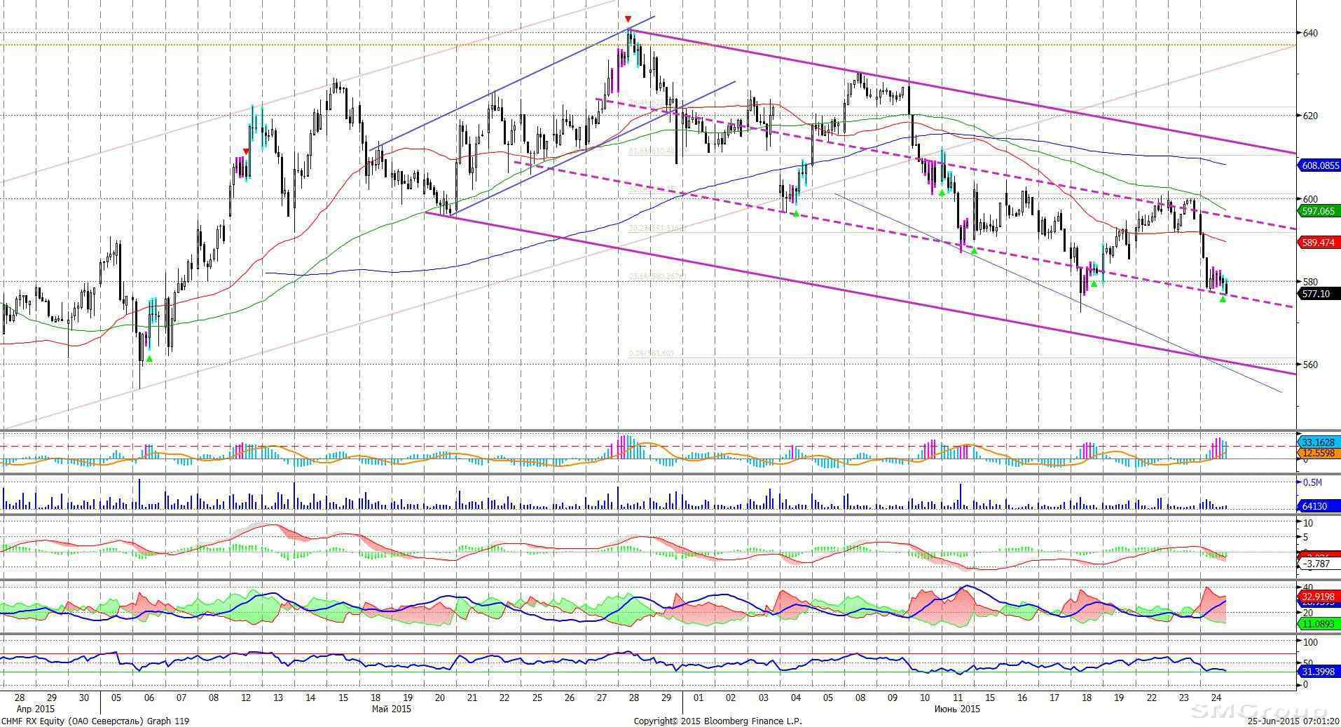 Северсталь – в пределах нисходящего канала. MACD сформировал сигнал вниз. ADX указывает на наличие нисходящего локального тренда. Осциллятор RSI дважды коснулся области перепроданности, сигнал вверх. Индикатор, основанный на динамике ADX, 24 июня дал сигнал к росту. Поддержка 576,00. Сопротивление: 592,00. Рекомендация: Держать.
