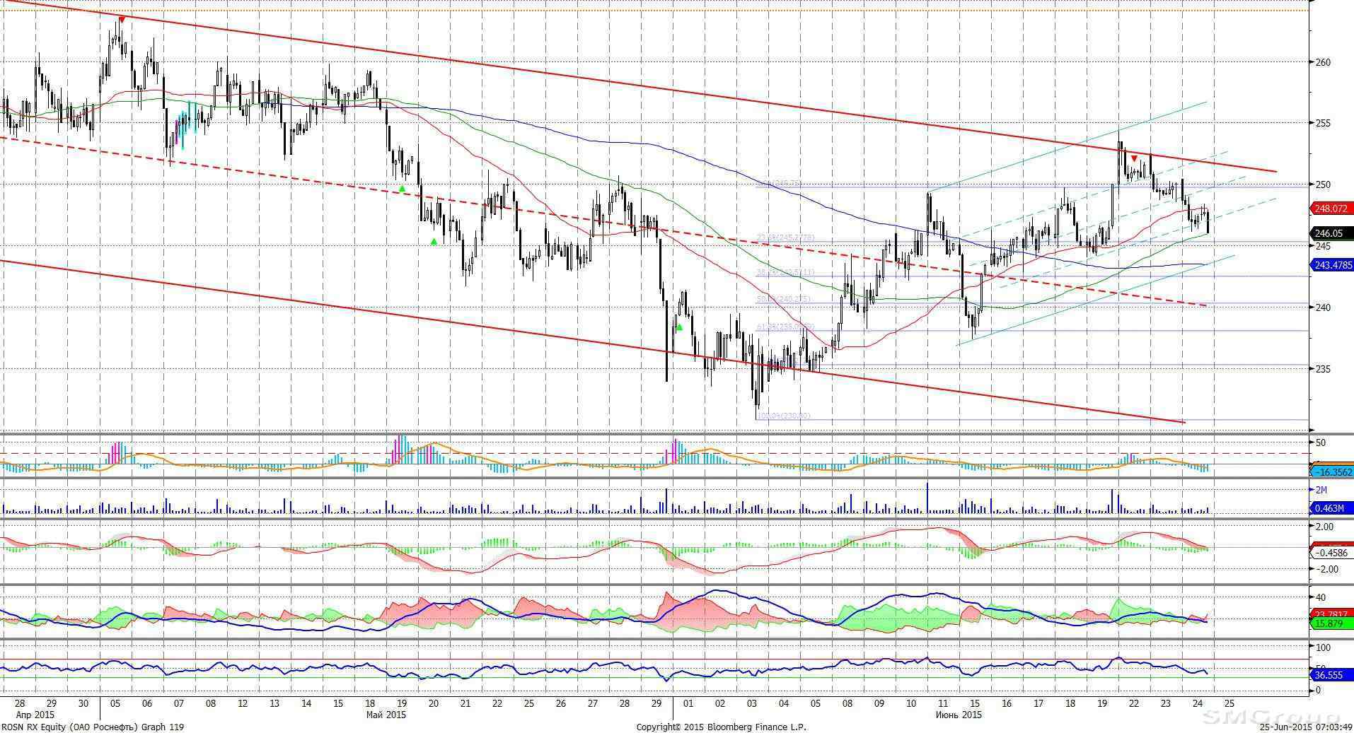 Роснефть – встретила сопротивление в верхней части умеренно нисходящего канала. MACD отрабатывает сигнал вниз. ADX указывает на попытку зарождения нисходящего локального тренда. Осциллятор RSI в средней части шкалы, сигналов нет. Индикатор, основанный на динамике ADX, в настоящее время выглядит нейтрально.