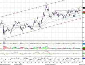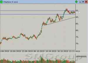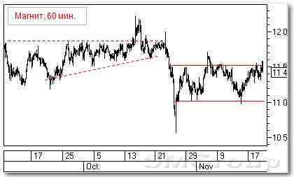 Краткосрочно: боковое движение В конце октября бумага резко пробивает уз-кий сужающийся боковик. Шип почти касается 10500 р. и следует мгновенный отскок более чем на половину снижения. С этого момента торговля входит в боковой диапазон в грани-цах 11000 – 11500 р. Последние три дня идет рост от нижней границы канала. Судя по кон-солидации под сопротивлением, быки могут попробовать его пробить.