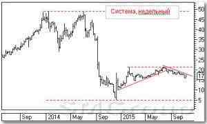 Среднесрочно: снижение Осенью 2014 г. бумага подошла к 12000 р. С этого момента медведи плотно встали на оборону уровня. До лета 2015 г. быкам никак не удалось прорвать сопротивление. И толь-ко в августе они смогли пройти выше 12500 р., но закрепиться там не удалось. Продавцы почти сразу отправили бумагу на исходные позиции. Есть наклонная поддержка с начала этого года. На коррекции довели цену до этой линии к концу сентября. Поддержка подтвердилась, и цена стала плавно расти. Однако медведи резко активизировались в конце октября и прорвали линию. Оформился падающий канал.