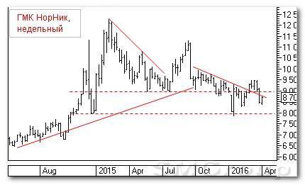 В декабре 2014 г. развивается ралли, и цена уходит к 11200 р. Следует коррекция, на ко-торой бумага почти касается линии тренда. Возобновление роста с обновлением истори-ческого максимума. Началась коррекция, и к лету 2015 г. сформировалось