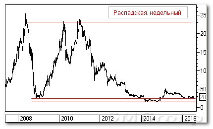 Долгосрочно: снижение С конца 2008 г. бумага показала три растущие волны. На третьей волне (от 7000 р. в 2014 г.) медведи стали заметнее проявлять себя. Несмотря на это, быки планомерно поджимали цену к сопротивлению, и в начале августа 2015 г. был выход к 13000 р. Но это оказался всего лишь прокол, так как медведи быстро погасили импульс. С этого момента начали обновляться локальные минимумы. В конце апреля идет мощный пробой растущего тренда. Медвежий флаг на 9000 р. раскрыли вниз. Бумага пришла к нижней границе канала и оттолкнулась от нее. Локальное сопротивление – 9500 р.