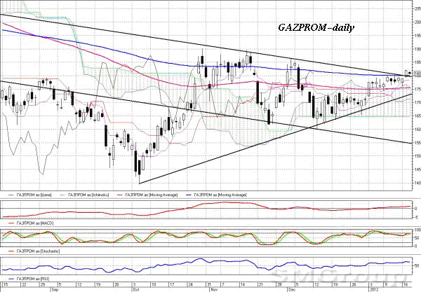 Теперь давайте взглянем на график Газпрома. Вчерашнее закрытие дня состоялось над линией нисходящего тренда, что стало серьезным сигналом на открытие длинной позиции. Сегодня я буду открывать небольшой «лонг» от 180,4р, увеличивать позицию буду в случае появления подтверждающих сигналов. Закрытие дня ниже 100-дневной EMA (175,5р) будет сигналом для закрытия длинной позиции.