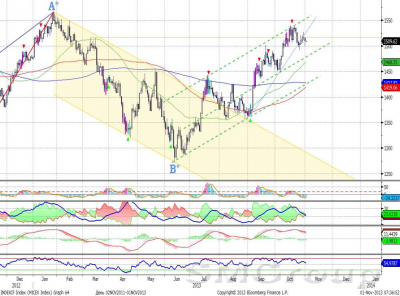 Индекс ММВБ – двинулся вниз от верхней границы восходящего канала. MACD сформировал сигнал вниз. ADX указывает на прекращение восходящего тренда, DMI+ и DMI- сошлись, ADX в средней части шкалы и направился вниз. Осциллятор RSI побывал в зоне